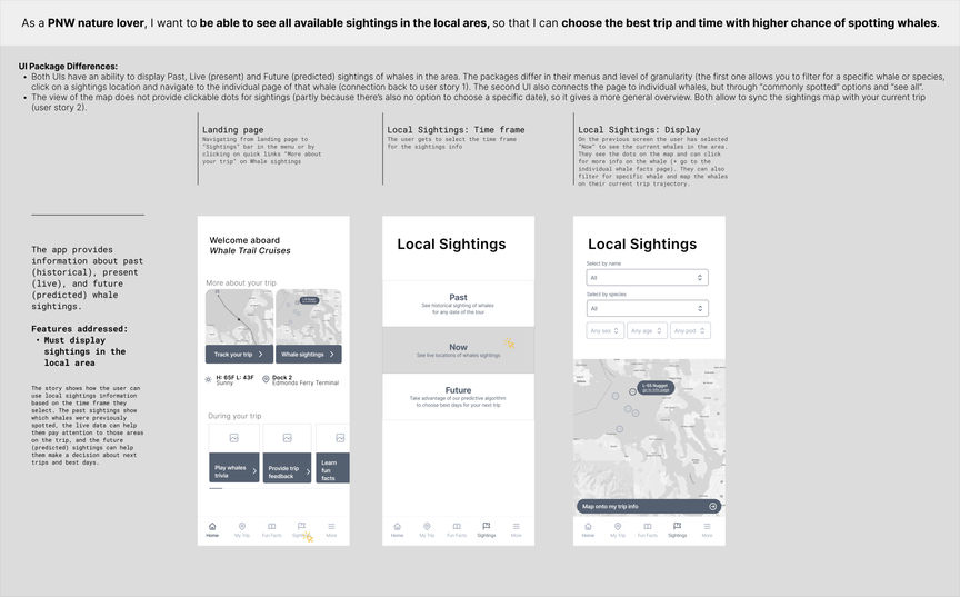 Additionally, the elective features I've chosen for the project after conducting user research: 1) Info about individual species 2) Info about the current trip 3) Feedback and raffle.